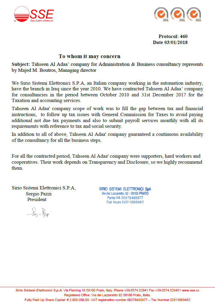 We got an italian tasted recommendation letter from Sirio Sistemi Elettronici Italian Company